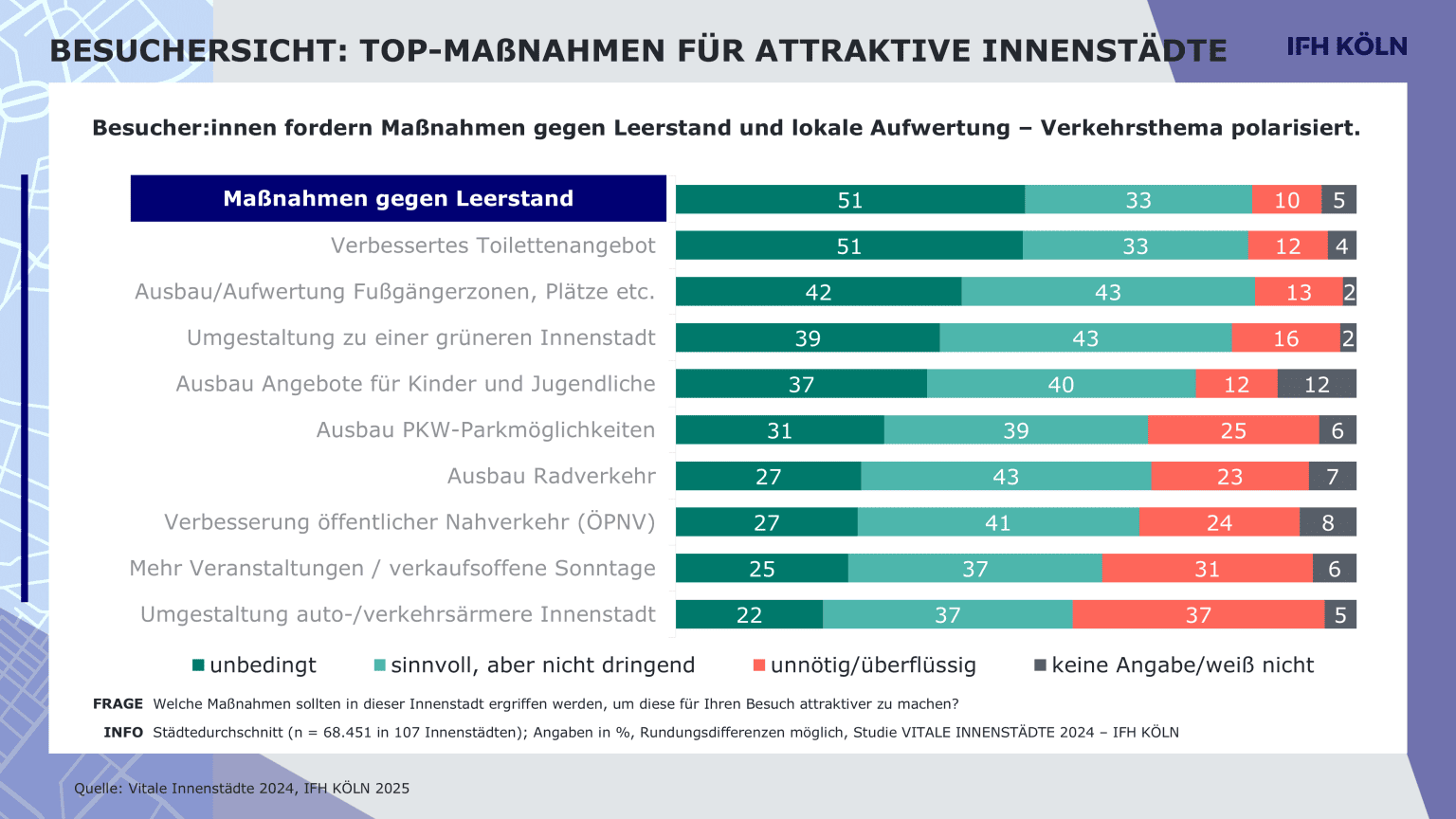 Das IFH Köln fordert daher, Innenstädte als gemeinschaftliche Aufgabe von Politik, Verwaltung, Immobilienbesitzern und Händlern zu verstehen. Nur durch koordiniertes Handeln, kreative Nachnutzungskonzepte und Investitionen in Aufenthaltsqualität könne es gelingen, die Attraktivität der Citylagen langfristig zu sichern.