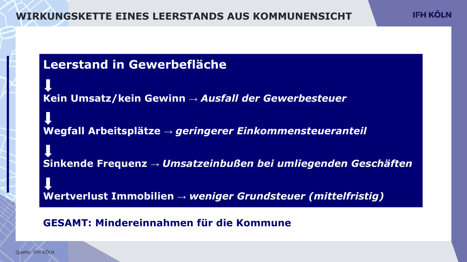 Das IFH Köln beziffert die Einbußen für Kommunen auf mehrere Millionen Euro pro Jahr. Diese ergeben sich aus entgangener Gewerbesteuer, sinkenden Grundsteuerwerten und indirekten Folgekosten durch weniger Besucher in der City. Auch die Immobilienwirtschaft leidet: Leerstände senken den Wert ganzer Lagen und erschweren Neuvermietungen.