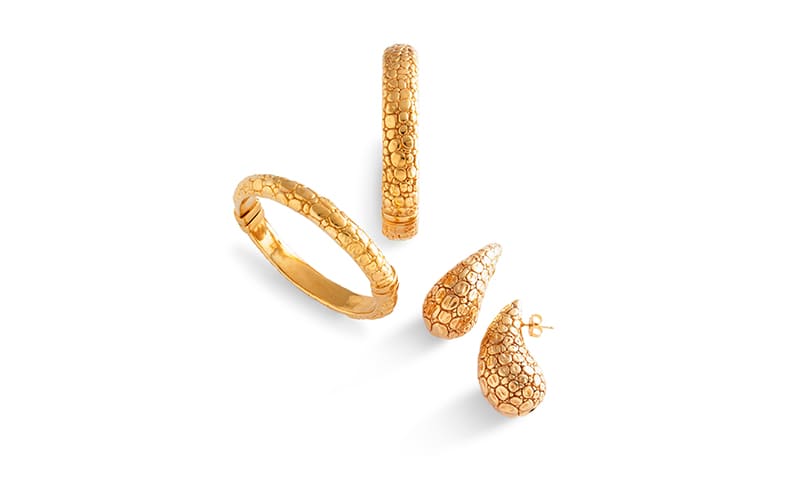 Bei den „Animalier“-Kollektionen bringt die sonnige Farbe des Gelbgolds die Oberflächen der organischen Formen zum Leuchten und unterstreicht deren Stil. Besonders faszinierend: „Krokodil“. Hier wird die Textur der Krokodilhaut auf einer leichten, tragbaren Struktur neu interpretiert. Dieselbe Eleganz findet sich auch in den gehämmerten Oberflächen der Kollektionen mit geometrischem Design wie „Rock“, denen die Farbe Gold eine noch zeitgemäßere Identität verleiht.
