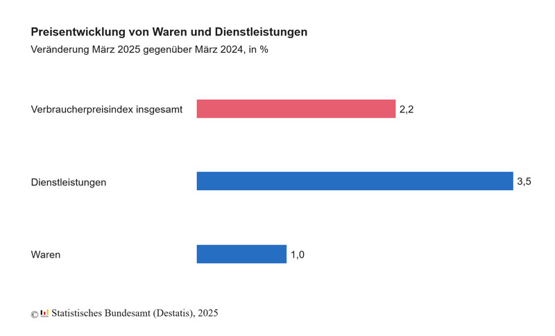 Die Inflationsrate in Deutschland – gemessen als Veränderung des Verbraucherpreisindex (VPI) zum Vorjahresmonat – lag im März 2025 bei +2,2 %.
