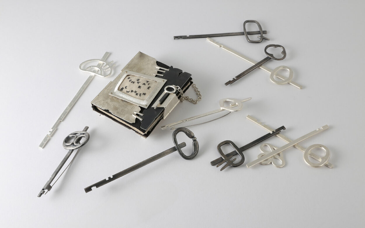 Die Arbeit, mit der Melina Köhler ihre Ausbildung am Pforzheimer Berufskolleg für Schmuck und Gestaltung abschloss, besteht aus zwölf Teilen: elf aus versilbertem Messing gefertigten Schlüsseln und einem kleinen Buch aus Leder, Leinen und ebenfalls versilbertem, teilweise geschwärztem Messing. Sowohl das Buch als auch einige der Schlüssel können dank einer Broschierung auch als Ansteckschmuck getragen werden.