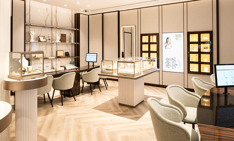 Das Obergeschoss ist dem Schmuck gewidmet. Mit Niessing, Schaffrath, Fope und Schmuckwerk bereichern weitere Top-Namen das Angebot. Ein Highlight ist die neue Trauringlounge: Paare können mithilfe eines Konfigurators aus einer Vielzahl an Möglichkeiten ihre persönlichen Trau(m)ringe gestalten. Für entspannte Beratung sorgt die elegante Spiegelbar, bei Kaffee oder Sekt und mit Blick auf den Mannheimer Wasserturm.