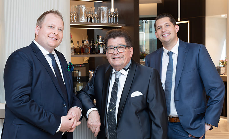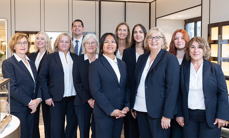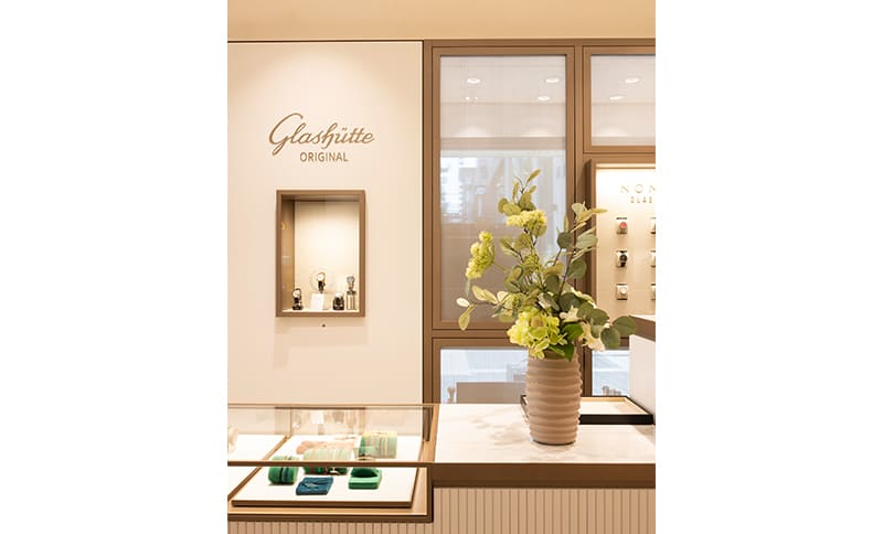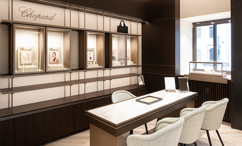 Das neue Haus bietet auf zwei Etagen rund 280 Quadratmeter Verkaufsfläche, ein Drittel mehr als bisher. Blocher und Partner, eines der führenden Architekturbüros im Retail-Design, hat das Interieur völlig neu gestaltet. Warmes Nussbaumholz, elegante Marmorelemente und ein stimmiges Lichtkonzept schaffen eine Atmosphäre, die sowohl exklusiv als auch einladend wirkt. Eine repräsentative Marmortreppe und ein Aufzug verbinden die beiden Ebenen.